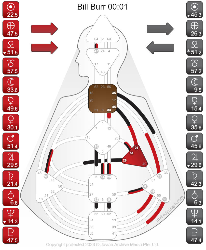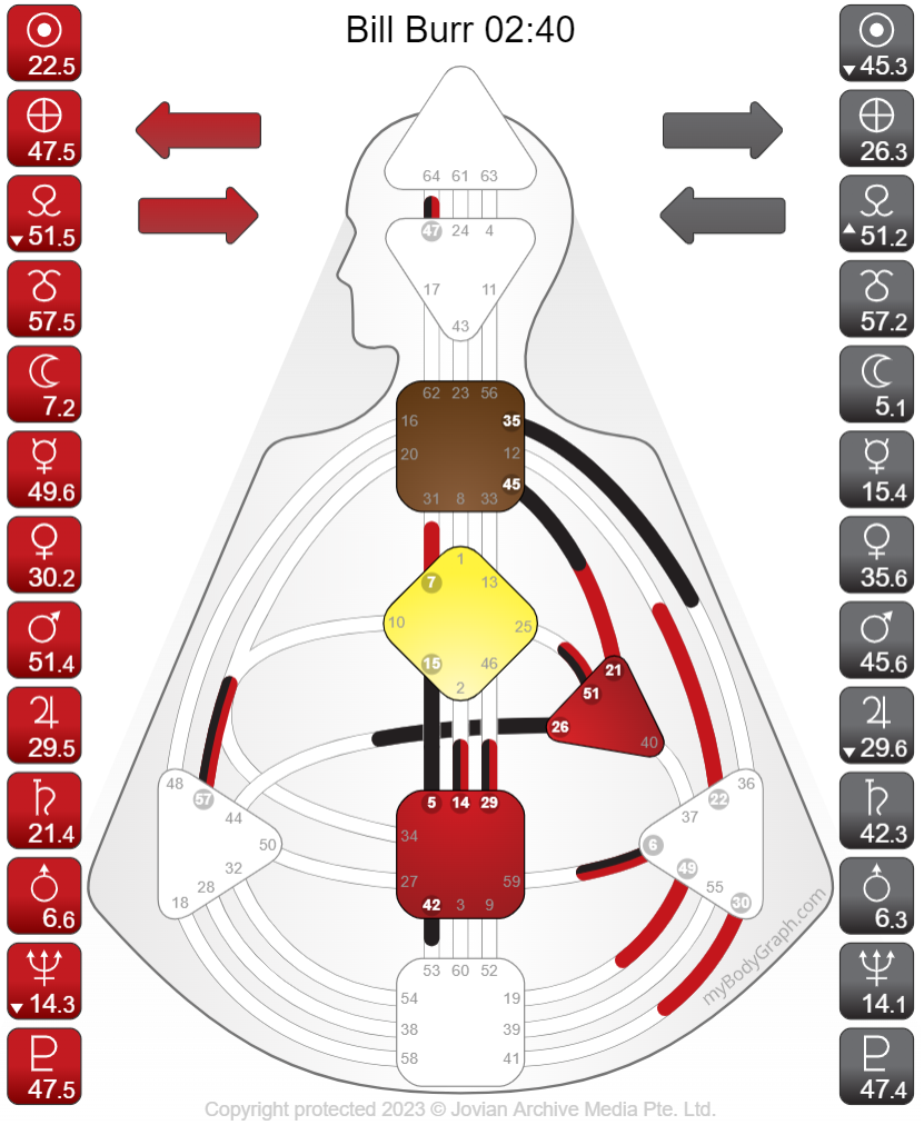 As you will see there is a decent amount of change in Bill’s chart that is flirting between Manifesting-Generator-Aura and Manifestor-Aura across three different Authorities (Ego, Sacral, or Solar Plexus). There are many combinations of Variables. Possible outcomes also include three different Profiles, 3/5, 3/6, 4/6, and a change in Definition of Single-Definition to Split-Definition and back to Single-Definition. Also noting a personality Sun-Gate progression of Gate-42.3 to Gate-42.4 and Earth-Gate progression of Gate-26.3 to Gate-26.4.